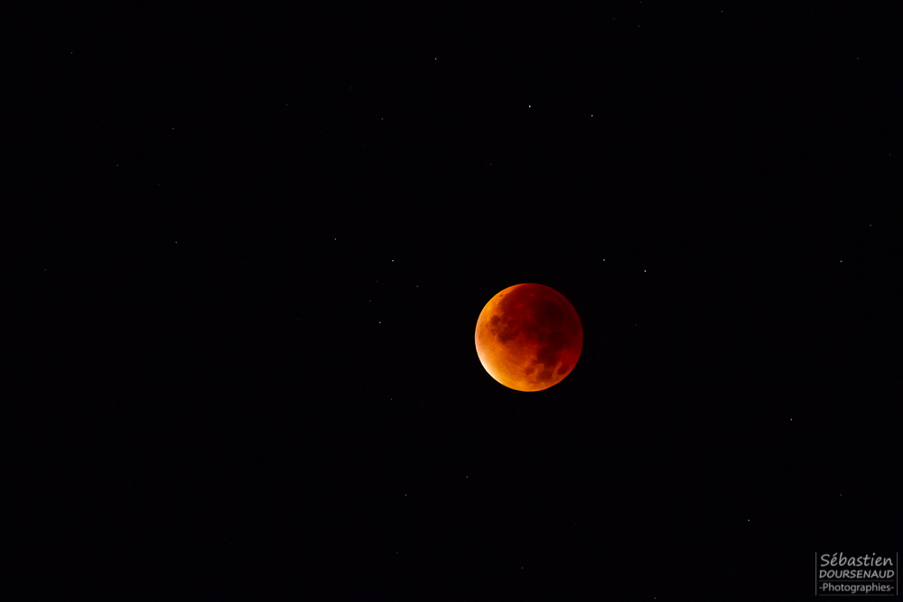 Pendant la phase de totalité, la Lune sera totalement rouge-brique voire brun-rouge. Oubliez les images à mains levées, je vous conseille longues focales et trépied. Attention toutefois à ne pas dépasser 2 secondes de pose à 200mm sous peine de filé. Pendant la totalité, la luminosité de la Lune est tellement faible qu'elle peut nécessiter jusqu'à 15s de pose à 100iso, il va donc falloir monter les isos, pas trop non plus pour pas avoir une bouillie de détails sur la surface lunaire.