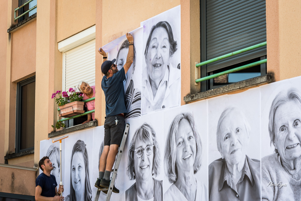 Après Châlus, me voici investi sur le projet de l’EHPAD de Nexon. Avec une nouvelle configuration, puisque cette fois-ci, c’est une approche photographique qui s’étalent en grand sur les façades de l’EHPAD, avec la collaboration de la plateforme Inside Out. Soumis aux conditions météorologiques, l’affichage est cependant temporaire.
